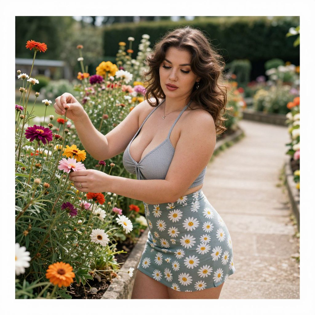 A Curvy woman in a ribbed grey halter crop top and a high-waisted A-line skirt adorned with a daisy print, enjoying a sunny day at a Flower garden with a stone pathway, captured in a lomography analog photo style. She is playfully arranging flowers, surrounded by vibrant blooms. Sexy. Pretty face and beаutiful eyes. Big breasts