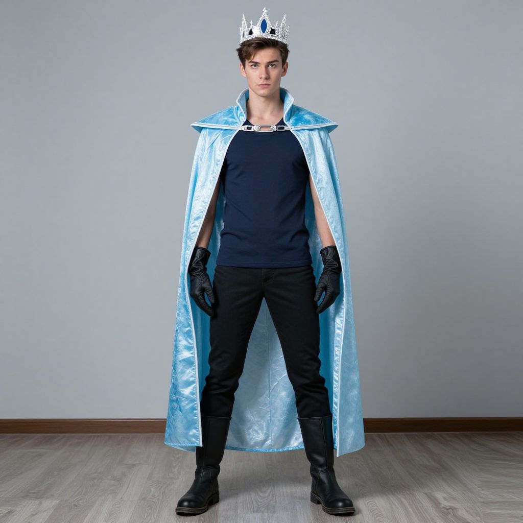 "ice man costume, 1boy, solo, male focus, gloves, boots, crown, standing, cape, full body Realistic photo of casual sexy person with pretty face"