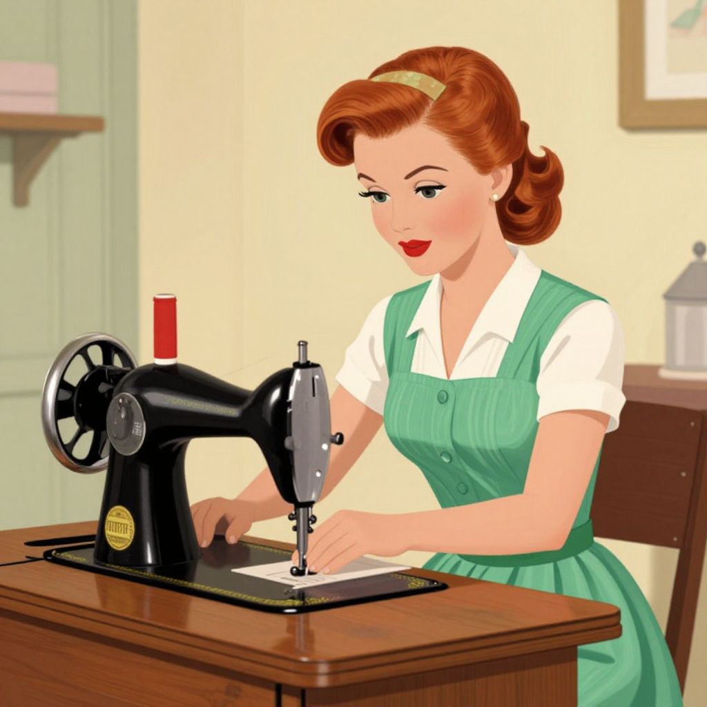 A vibrant retro-style illustration depicts a woman with red hair styled in a classic updo, dressed in a green dress with white sleeves, operating a vintage sewing machine on a wooden table, exuding a nostalgic and charming aesthetic reminiscent of mid-century clip art.