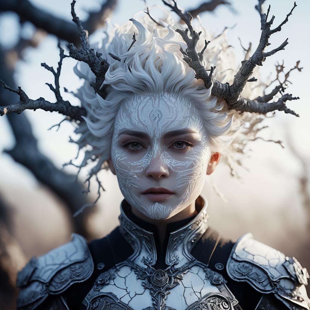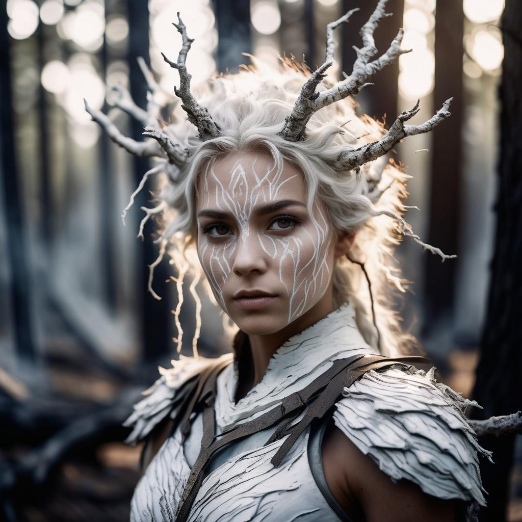 Cinestill 50D photo portrait of a fearless wildfire sprite with white bark skin, detailed, hair as white gnarled branches, 50mm lens, f/1.4, ethereal, volumetric lighting, dreamy outdoor setting, in the style of Jacob Melendez, Arthur Rackham