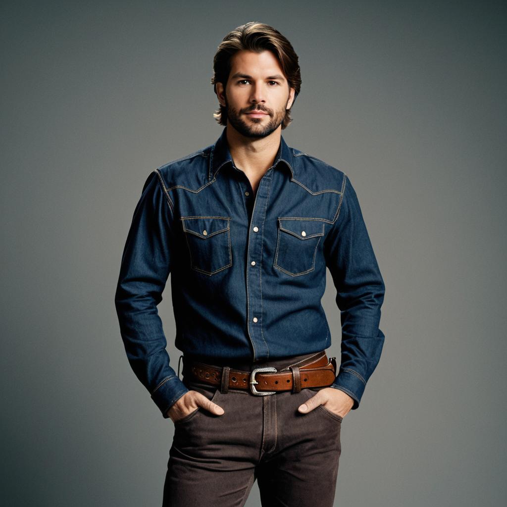 Portrait of a young man with brown hair and facial hair standing against a grey background. He is wearing a dark blue denim long-sleeve shirt with buttoned pockets, brown pants, and a brown leather belt. The man has his hands in his pockets and looks directly at the camera with a closed mouth expression.