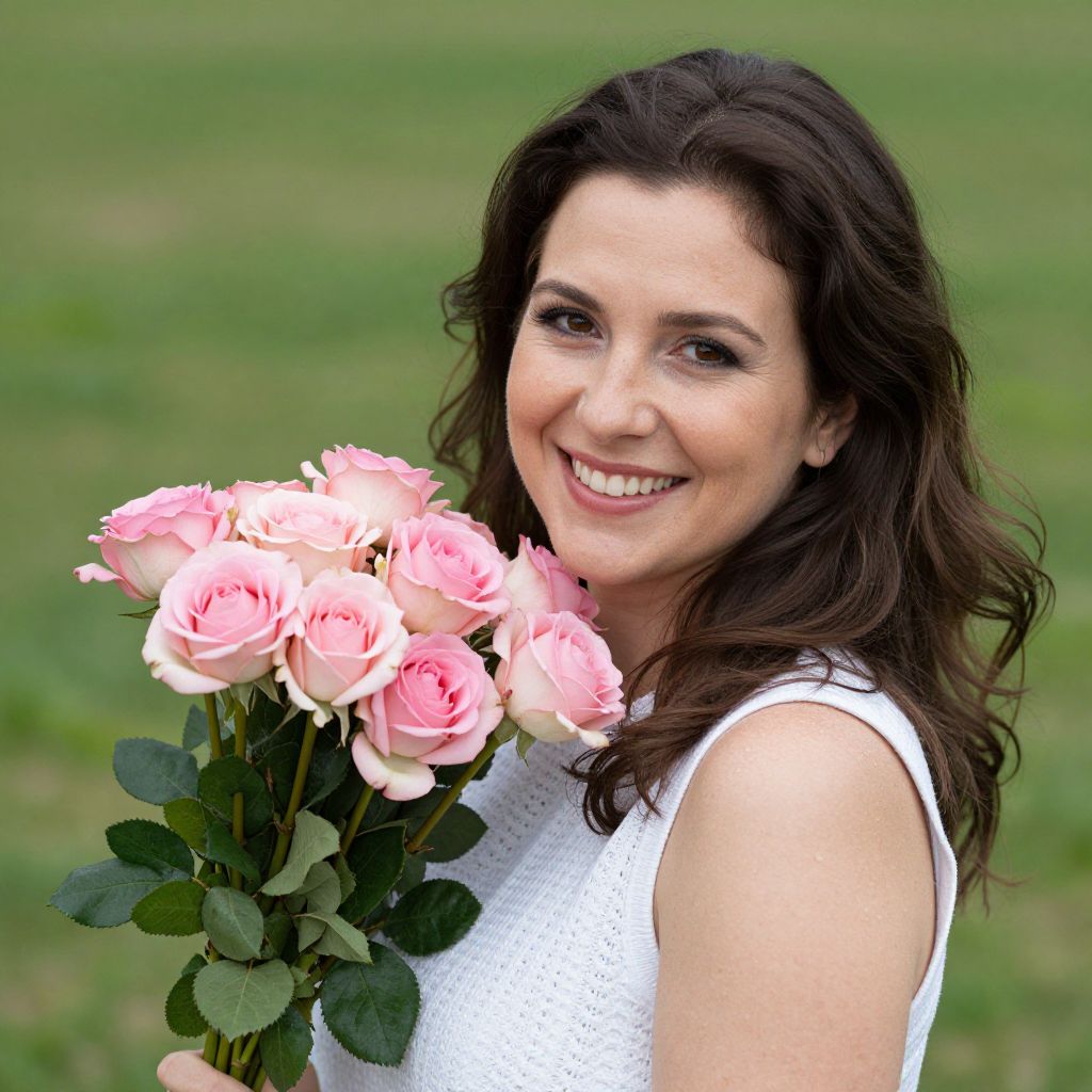 Photograph of a smiling woman with wavy brown hair, holding a bouquet of pink roses, wearing a white sleeveless top, against a green grass