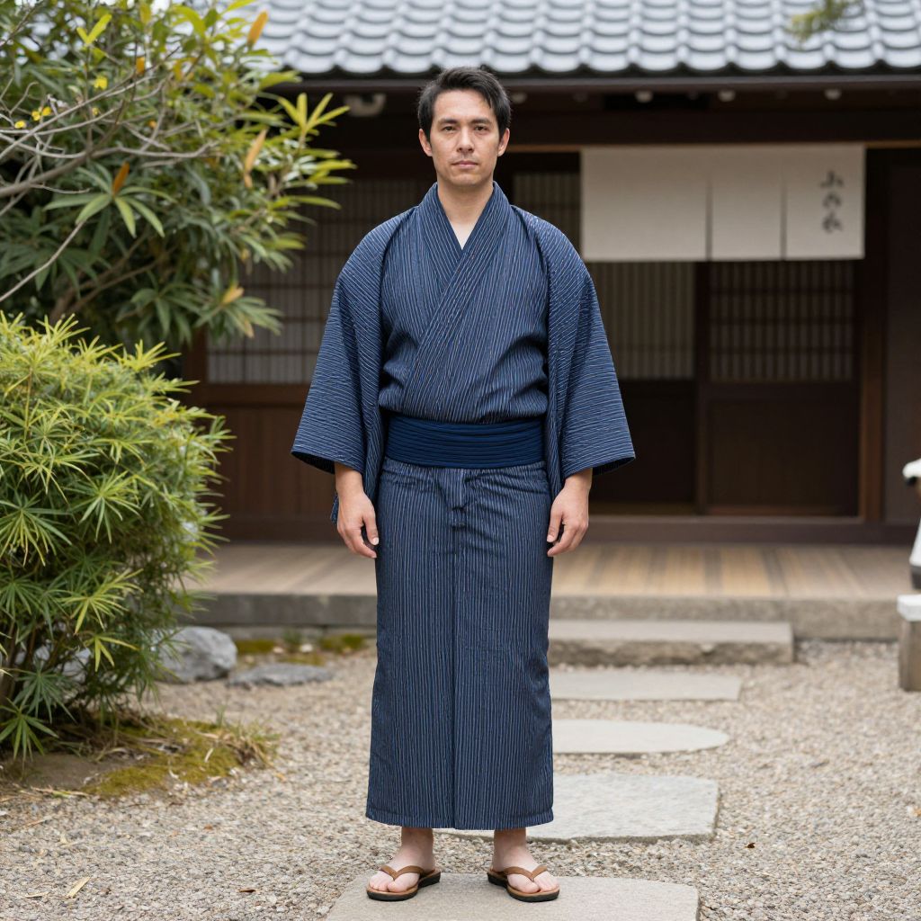 Simple Festival Male Costume, man in a kimono standing in a yard