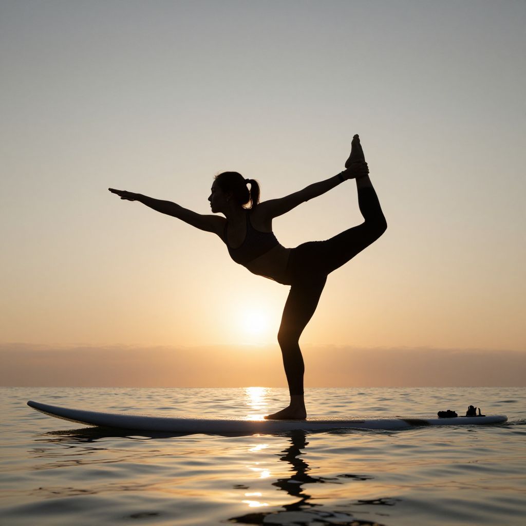 Balancing serenity and grace, a silhouette of a woman practices yoga on a surfboard at sunrise, embodying the harmonious dance between human spirit and nature’s eternal rhythm.