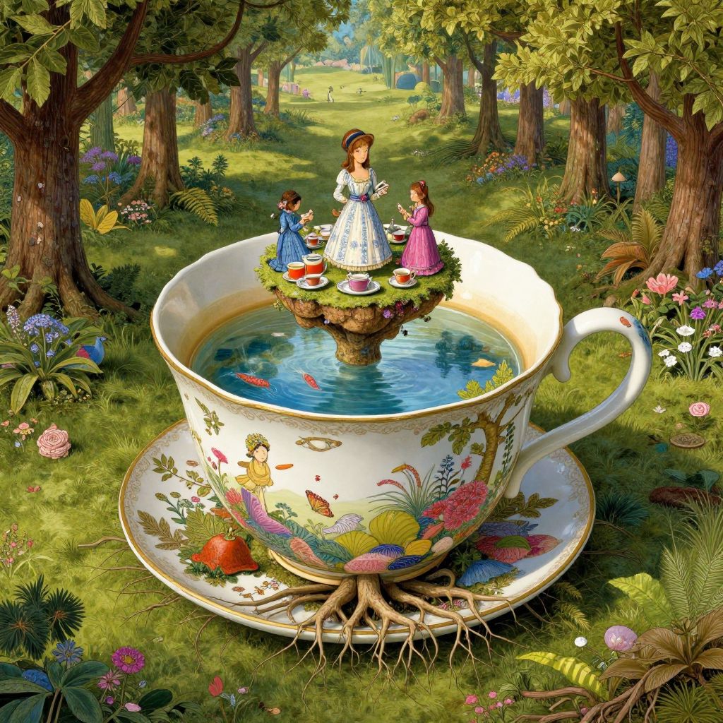 Digital illustration of a whimsical forest scene. A large, ornate teacup with floral and bird designs sits on a matching saucer, filled with blue water. Inside the teacup, three miniature, detailed doll-like figures in colorful dresses stand on a floating, leafy island. The background features lush green trees, colorful flowers, and a sunlit forest path. The teacup's handle is on the right, and its roots extend into the grassy ground. The overall style is vibrant and fantastical, with rich colors and intricate details.