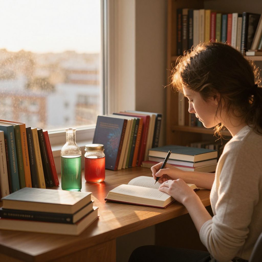 Sunset illuminates a cozy study where a woman sits at a wooden desk, writing in an open book while surrounded by shelves of colorful books, a glass bottle of green liquid, a jar of red liquid, and a stack of three books, all bathed in warm golden light streaming through a window overlooking a cityscape.