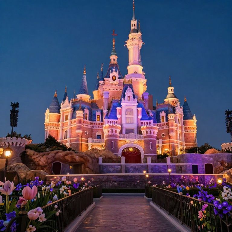 The image depicts a stunning fairytale castle reminiscent of a Disney-style masterpiece, majestically perched on a hill. The castle is adorned with numerous spires, each illuminated from within, casting a warm glow that contrasts beautifully with the cool, moonlit night sky. The intricate details of the castle's architecture, including ornate windows and balconies, are highlighted by the soft lighting, creating a sense of enchantment and wonder. A winding staircase, lined with stone railings and illuminated by lanterns, leads up to the castle's entrance, inviting visitors to explore its magical interiors. Surrounding the castle are lush, vibrant plants and flowers, their colors ranging from soft pinks to deep purples, adding to the fairy-tale ambiance. The overall composition is balanced, with the castle centrally positioned, flanked by the natural beauty of the hillside, creating a harmonious and dreamlike scene that evokes a sense of magic and wonder.