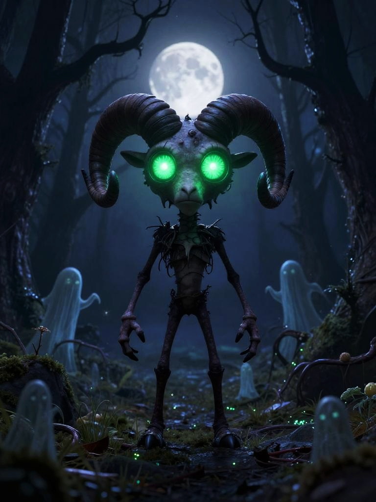 Spooky stylized ram character standing upright in the center of a dark eerie forest clearing at night, huge glowing toxic green eyes staring at the viewer, long skinny limbs and slightly exaggerated proportions, surrounded by twisted trees and faint ghostly silhouettes, glittering spores filling the air, full moon glowing in the background, cinematic wide-angle shot, dark whimsical gothic fantasy style, highly detailed 3d illustration, soft volumetric soft indigo backlight, high resolution