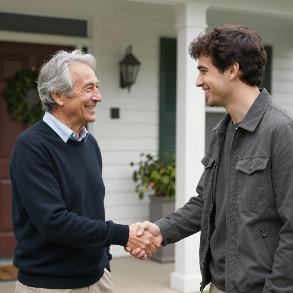 Photograph of a man with gray hair and glasses, wearing a white shirt and suspenders, repairing a bike for a young man with dark curly hair, wearing a blue and white raglan shirt. They are in a room with bamboo blinds, a lamp, and a small table. The older man is focused, leaning forward, while the younger man sits, looking at him. Sunlight filters through the blinds.