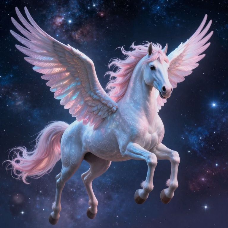 In this breathtaking, hyper-realistic 16k image, a majestic Pegasus, adorned with intricate details and a regal demeanor, is captured in a dynamic pose, seemingly in mid-flight. The Pegasus, with its powerful wings spread wide, is depicted in a cosmic setting, surrounded by a galaxy of stars and nebulae, adding a mystical and otherworldly atmosphere to the scene. The horse's body is detailed with shimmering textures and a gradient of colors ranging from deep blues to soft pinks, enhancing its ethereal quality. The Pegasus's mane and tail flow gracefully, complementing the fluidity of its wings. The background is a stunning blend of dark and light, creating a sense of depth and vastness, while the Pegasus stands out as the central figure, its presence dominating the composition. The overall scene is a harmonious blend of celestial elements and fantastical creatures, evoking a sense of wonder and awe.