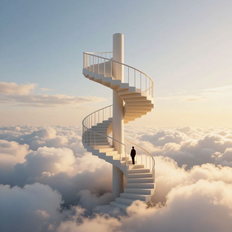 A surreal 3D-rendered spiral staircase ascends through a dreamlike sky, its steps defying gravity as they twist into the clouds, illuminated by golden-hour sunlight, inviting a solitary figure to embark on a journey through the ethereal heavens.