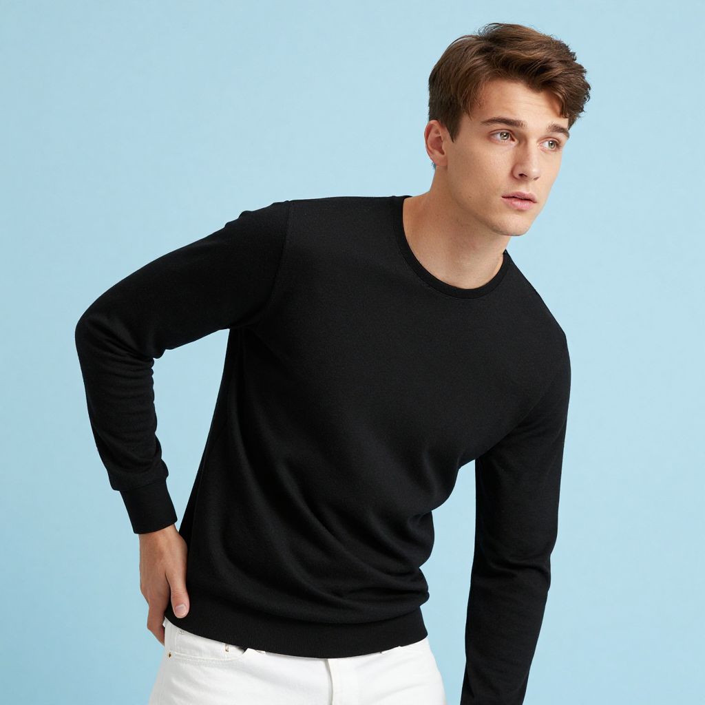 Photograph of a young, Caucasian man with short brown hair, wearing a black long-sleeve shirt and white pants. He's leaning slightly forward with his right hand on his hip, looking to the right with a neutral expression. The background is a solid light blue, and the image has a modern, clean aesthetic with soft lighting.