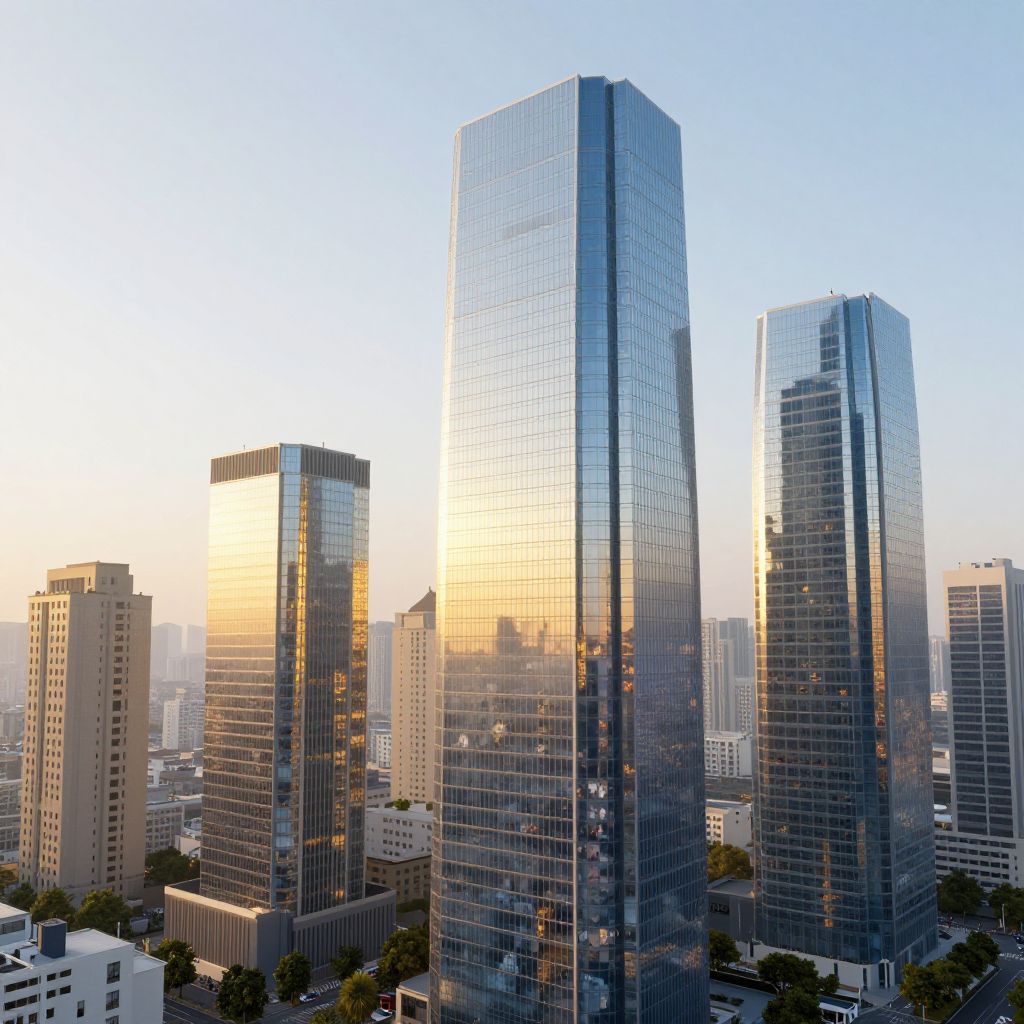A futuristic cityscape rendered in high-definition 3D realism features mirrored glass skyscrapers that reflect not just the sky but also the ethereal glow of golden hour, each building seemingly encapsulating the forgotten childhood memories of its inhabitants through its reflective surfaces.