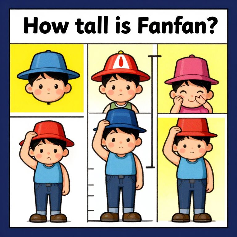 Vibrant comic-style panel illustrating the question 'How tall is Fanfan?' showcasing Fanfan trying on different sized hats with exaggerated height markers, lively colors, and expressive facial features.