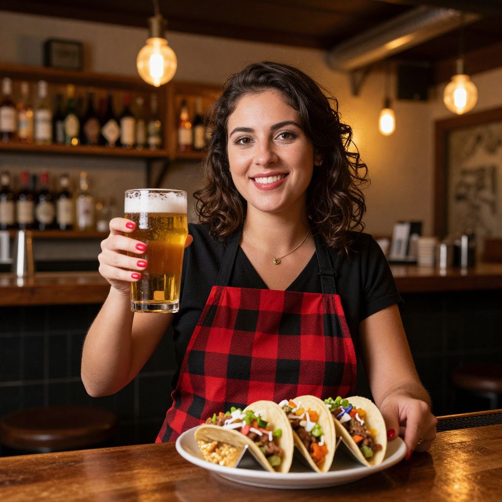 Warmly lit bar scene featuring a smiling woman wearing a red-and-black checkered apron, holding a frothy glass of beer in her right hand and a plate of colorful tacos in her left, surrounded by shelves stocked with bottles and hanging pendant lights casting a cozy ambiance.