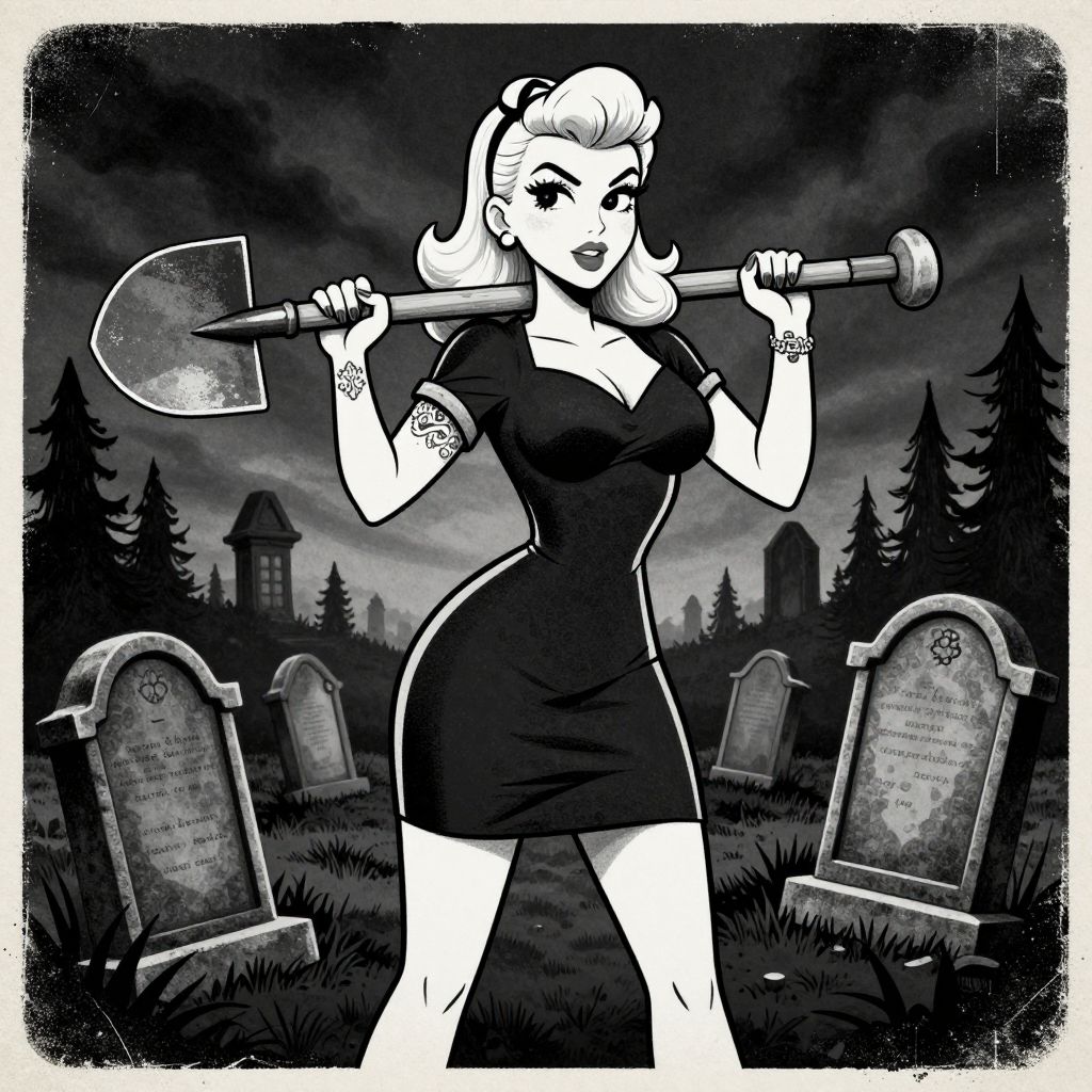 The image is a highly detailed, retro distressed cartoon-style illustration featuring a vintage-style pin-up beauty with a gothic cemetery background. The blonde woman, dressed in a form-fitting, short-sleeved dress, stands confidently with a shovel over her shoulder, exuding a strong and determined presence. Her hands are intricately drawn, showcasing a tattoo effect, adding to the vintage aesthetic. The cemetery setting is filled with tombstones, gravestones, and eerie tombstones, creating a dark and gothic atmosphere. The overall composition is balanced, with the woman centrally positioned, surrounded by the gravestones and tombstones that frame her figure. The black and white color scheme enhances the vintage and gothic feel, while the distressed texture adds a sense of age and wear. The illustration is highly detailed, with textures that mimic the look of paper or canvas, giving it a tactile quality. The spatial relationships are well-defined, with the woman in the foreground, the gravestones and tombstones in the mid-ground, and the dark, ominous sky in the background, creating a sense of depth and perspective.