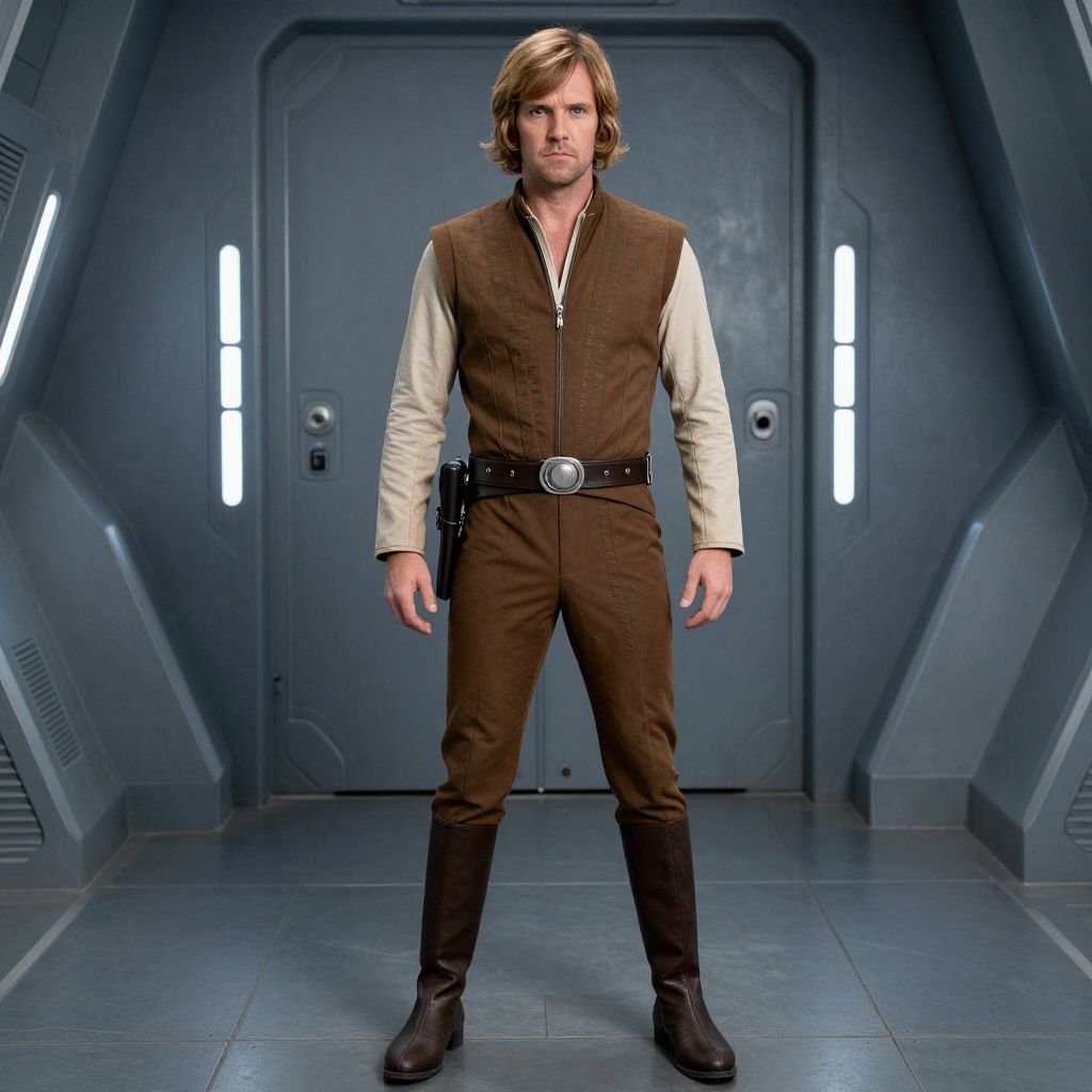 Photograph of a man standing in a futuristic, metallic corridor. He has medium-length, wavy brown hair and a serious expression. He is wearing a brown vest over a beige shirt, brown pants, and black boots. A black belt with a circular buckle is fastened around his waist. The background features a dark gray, heavily textured wall with two vertical light strips on either side of a large, recessed door. The floor is metallic and reflects light subtly. The overall style is reminiscent of a sci-fi or Star Wars setting.