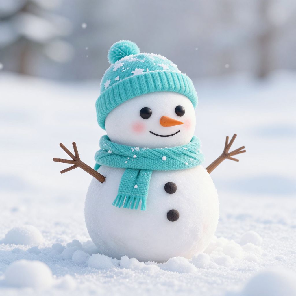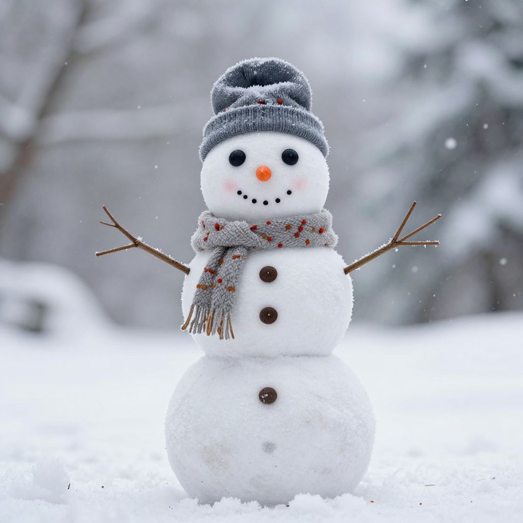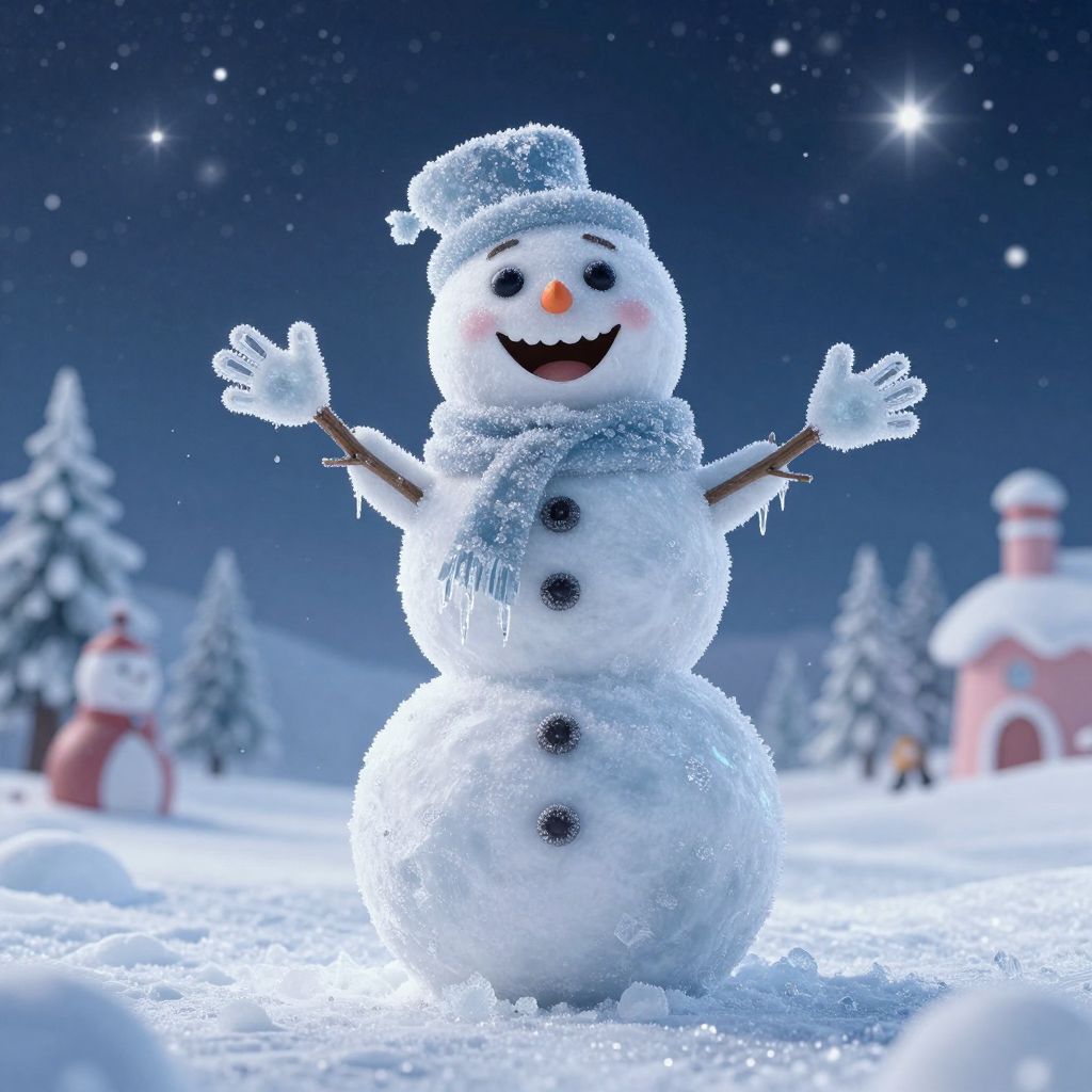 Child joyfully building a snowman in a festive winter scene, wearing a red hat and coat against a backdrop of falling snowflakes and stars.