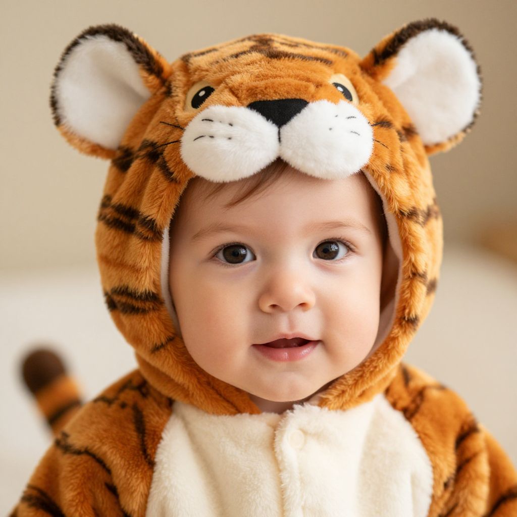 "Tiger Toddler, a close up of a child wearing a tiger costume"