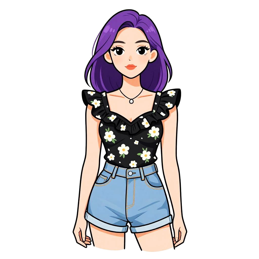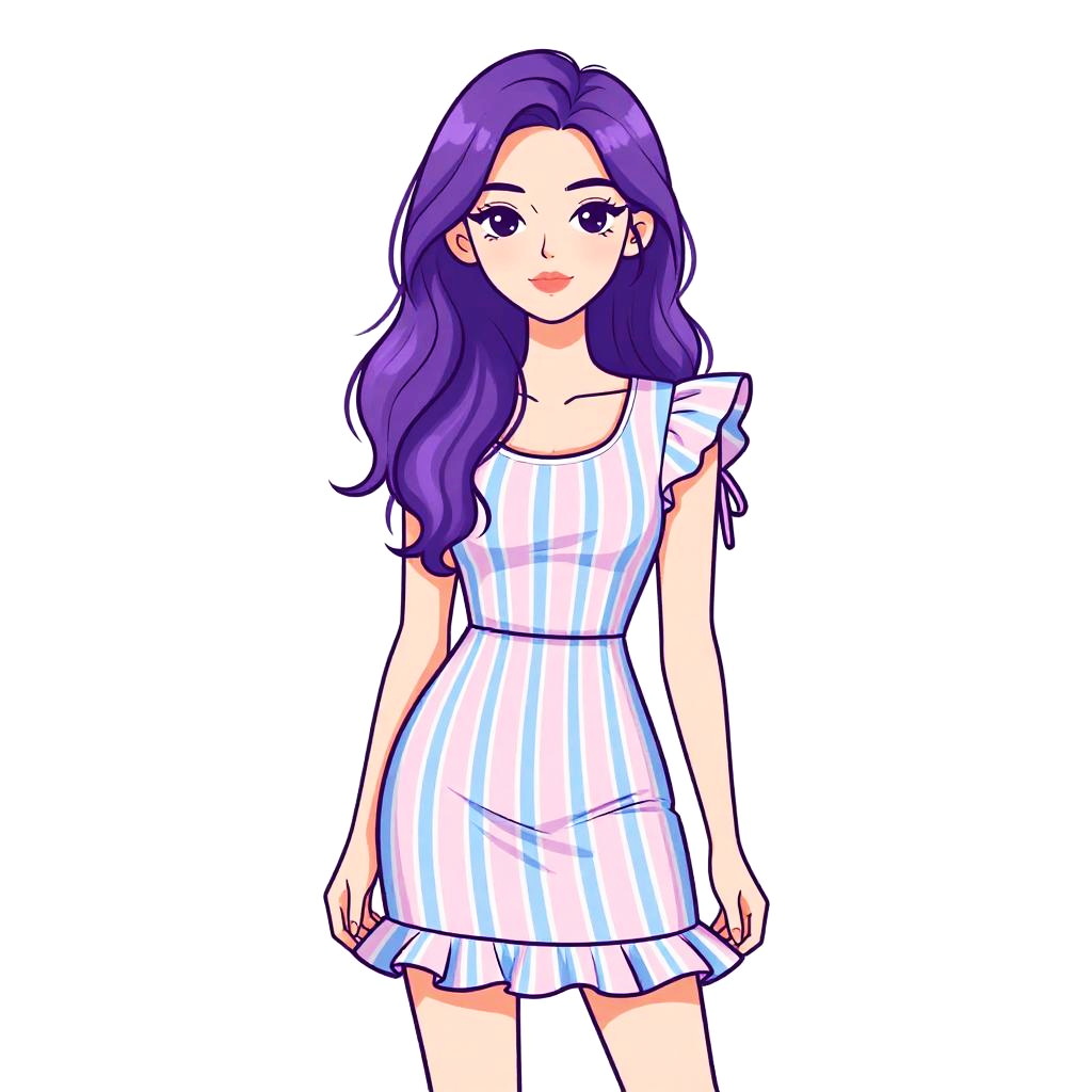 Woman with pretty face and pretty hair. Woman, romantic style, short flutter-sleeve dress with a floral print in pastel tones, scoop neckline, fitted bodice with decorative seams, peplum-style tiered ruffle skirt, above-knee length, simple hairstyle with hair half-pulled back and secured with a clip, white background. --sref 1467