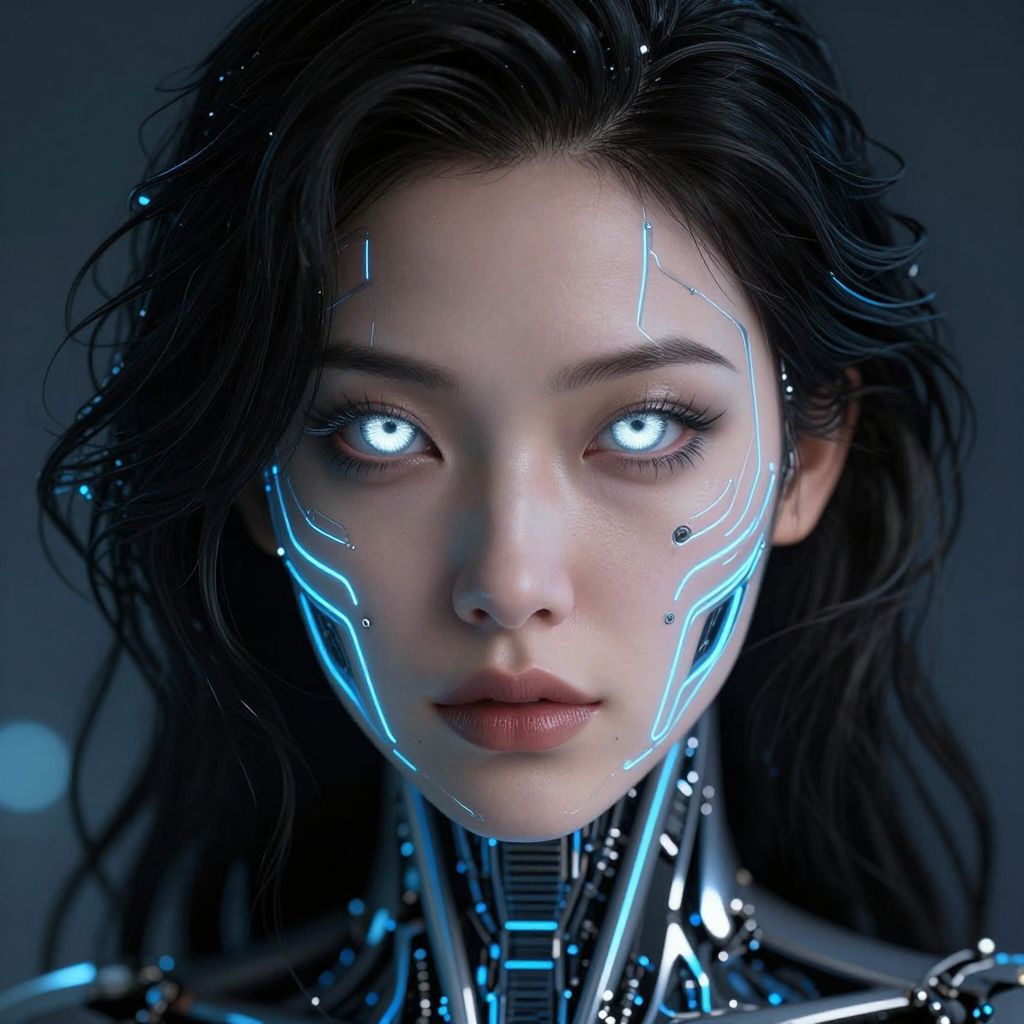 Digital portrait of a young woman with glowing green eyes, pale skin, and cybernetic neck collar, illuminated in blue light.