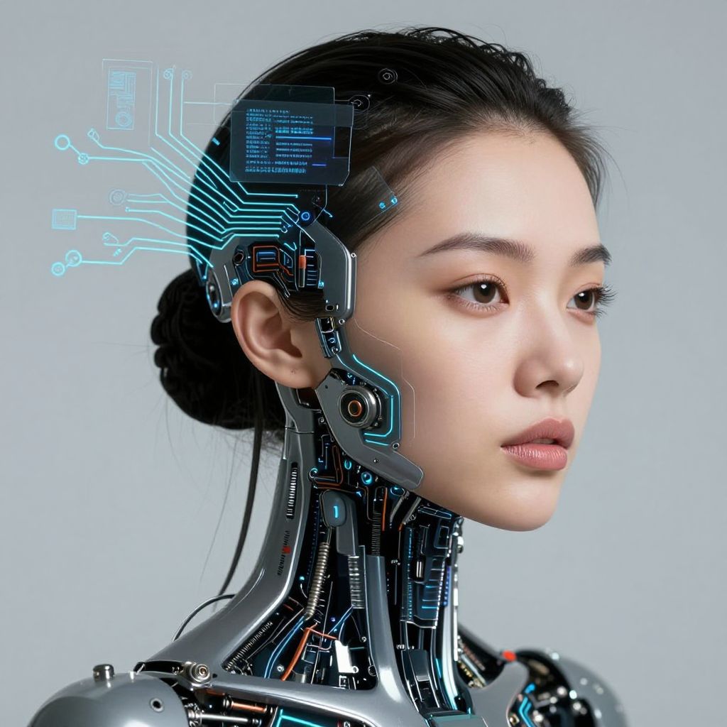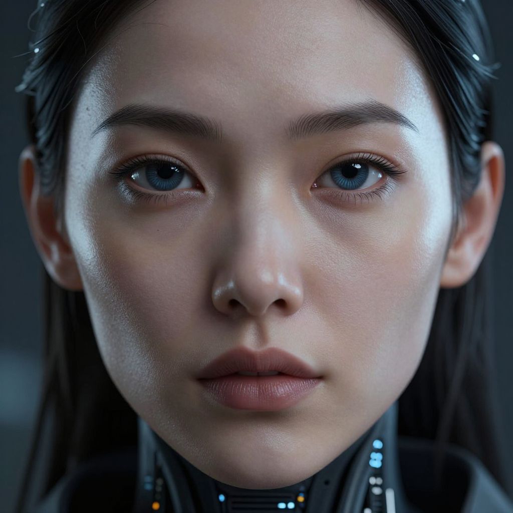 This is a hyper-realistic digital CGI portrait of a young woman with light skin and striking green-blue eyes. Her dark brown hair is parted to the side, and her expression is calm and slightly introspective. She wears a high-tech, cybernetic necklace with glowing blue lights. The image has a cool blue and purple color palette, with subtle light reflections on her skin. The background is a dark gradient, keeping the focus on her face and cybernetic accessory. The image has a futuristic, sci-fi aesthetic.