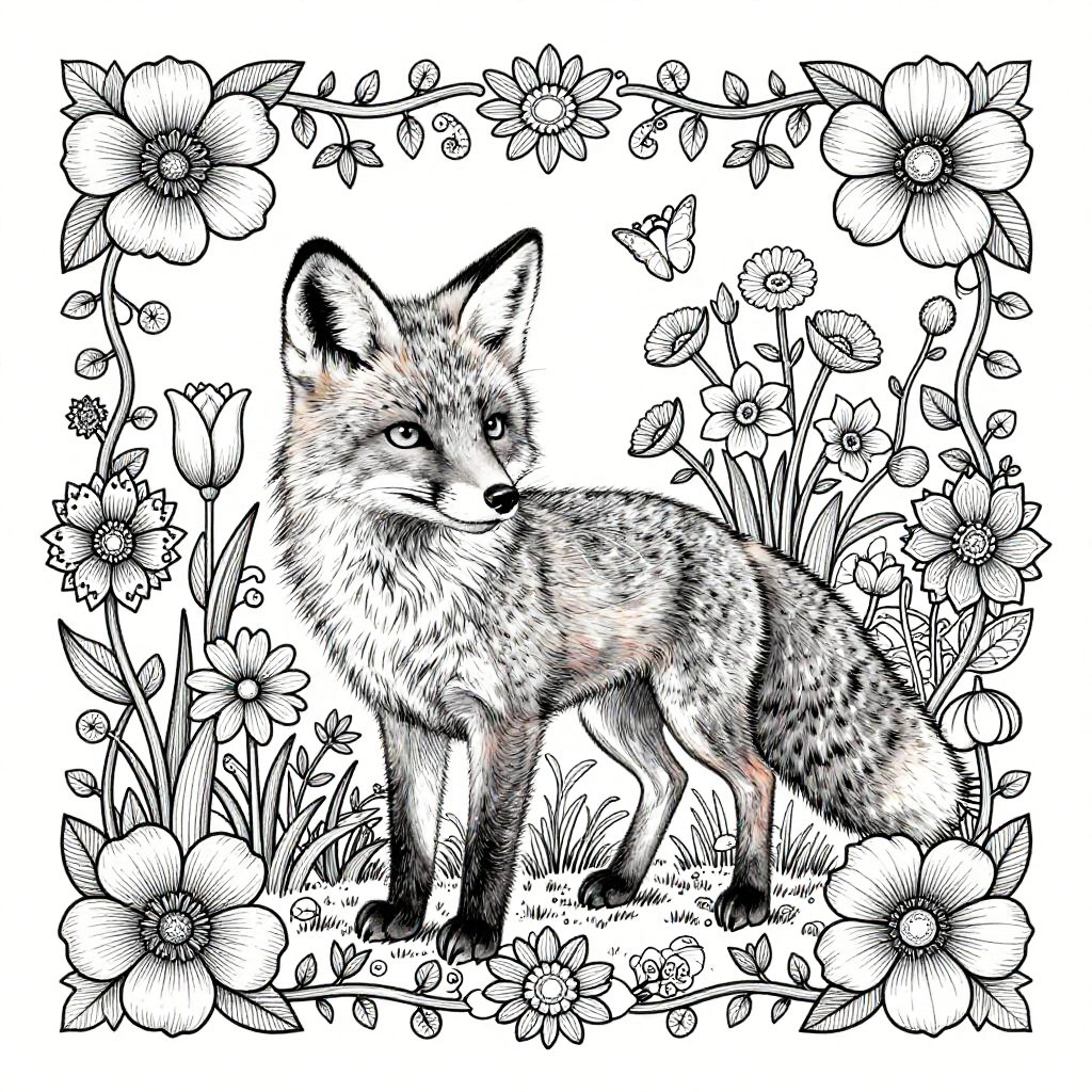 Detailed fox coloring pages illustrating a playful fox amidst a garden of exotic flowers and vines, enriched with symmetrical patterns and fine detailing for advanced coloring art enthusiasts.