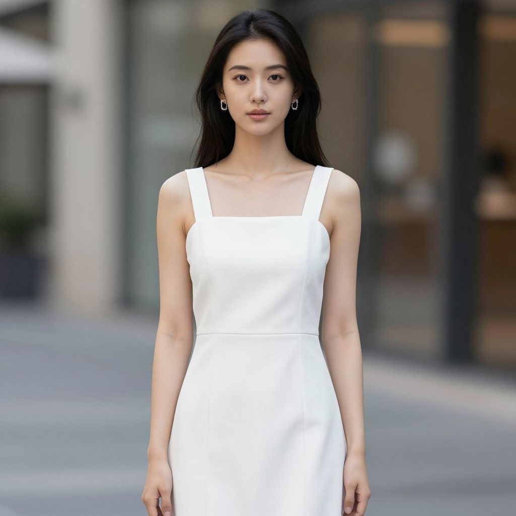 Photograph of an Asian woman with long black hair, wearing a sleeveless white dress, standing in an urban outdoor setting.