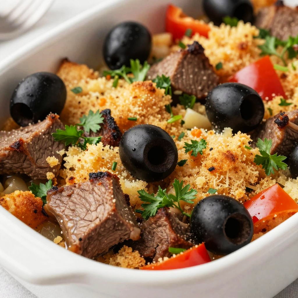 A close-up photo of a colorful, freshly baked casserole. The dish is packed with crispy, golden-brown bread crumbs, chunks of browned meat, vibrant green chopped parsley, small black olives, and bits of red bell pepper. The casserole is in a white ceramic dish, with a slightly blurred background that emphasizes the textures and colors of the ingredients. The image has a bright, appetizing feel.