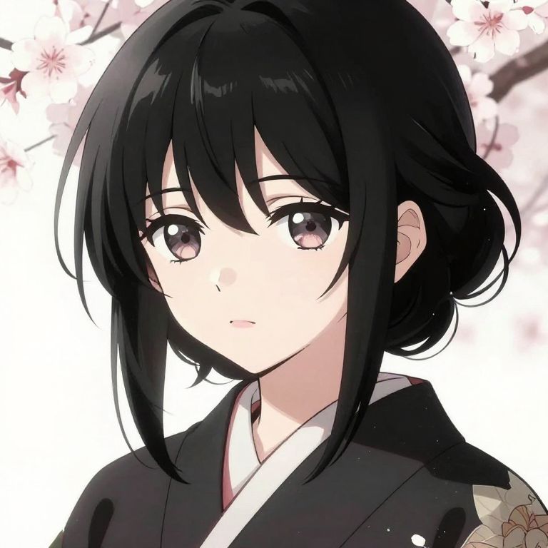 Anime black hair girl pfp, close-up of a delicate anime girl with sleek black hair, styled with gentle waves, wearing a modern kimono, soft glowing light highlighting her features, intricate shading and highlights, captivating gaze, minimalist background with cherry blossoms