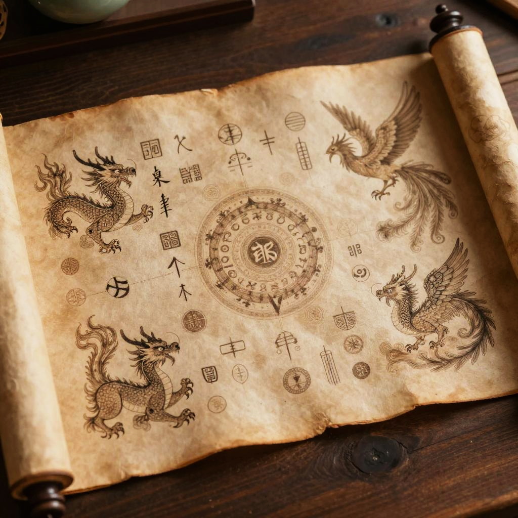 Ancient Dao Scroll with Mythical Creatures