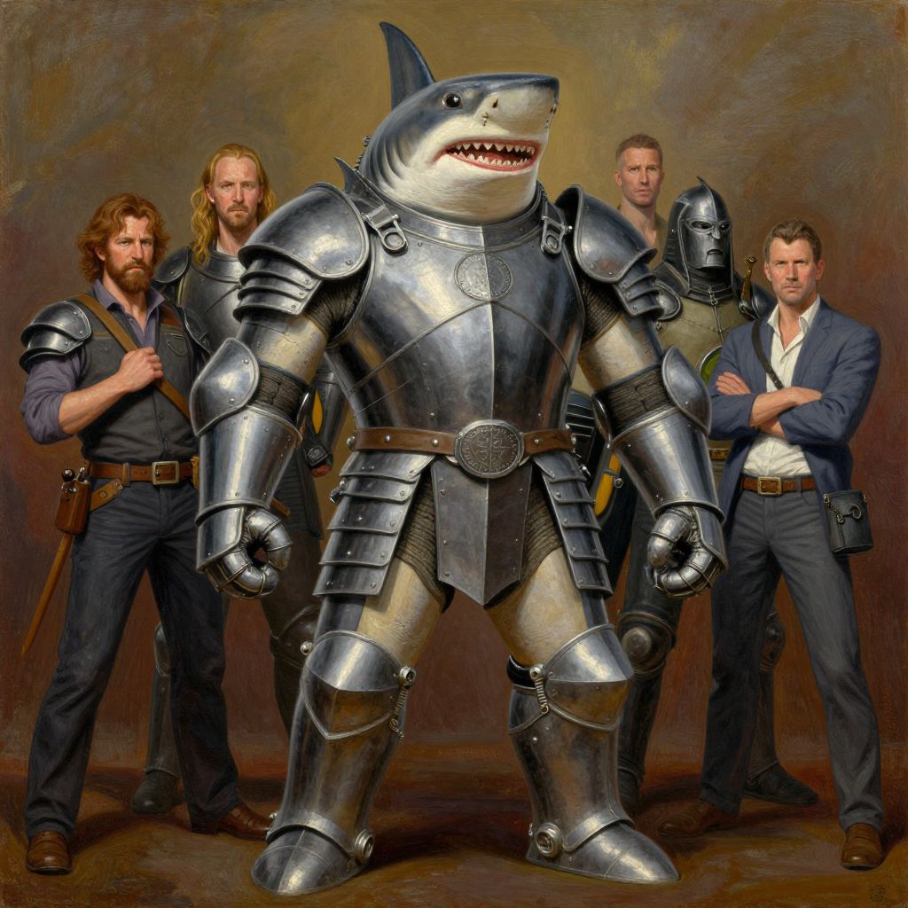 Oil painting full body portrait of huge anthropomorphic shark in iron armour, norman rockwell, jack kirby, greg manchess, alex ross, bergey, zdzislaw beksinski, ruan jia, jeremy mann, tom lovell, marvel illustration
