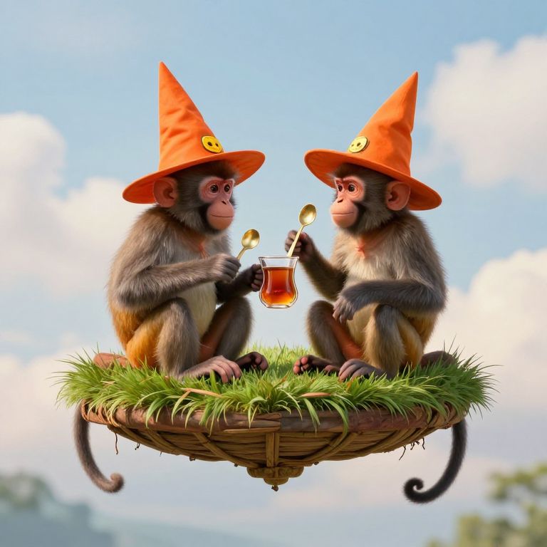 Two monkeys donning vibrant orange wizard hats sit atop a suspended grassy platform, each holding golden spoons as they engage with a glass of amber tea, set against a serene sky dotted with fluffy clouds.