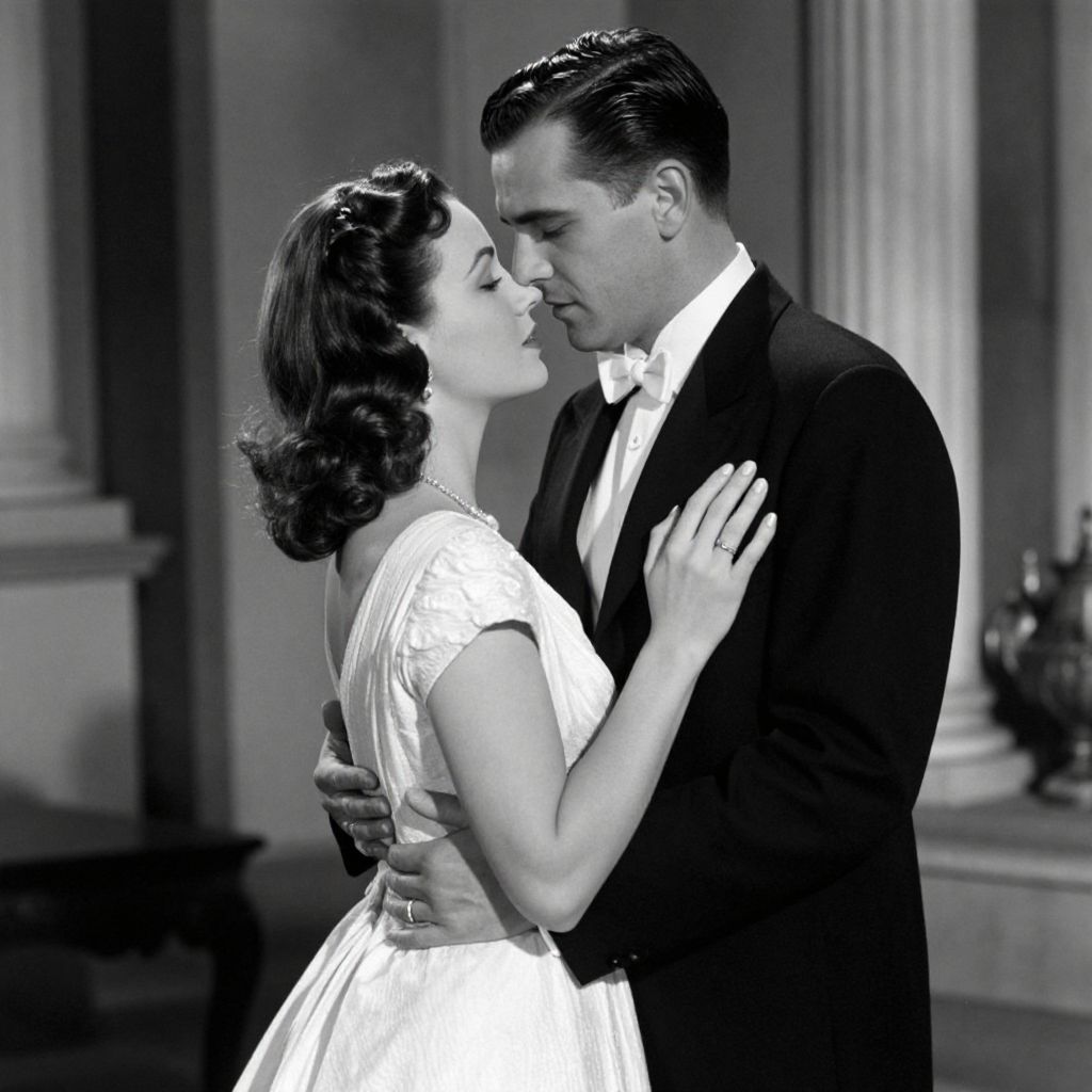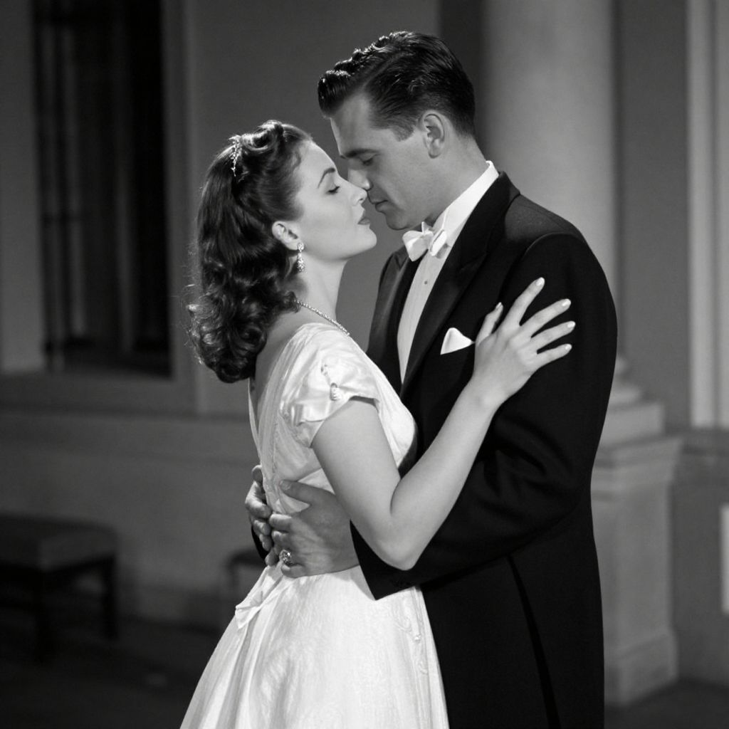 A black-and-white, cinematic composition captures a romantic embrace between a man in a classic tuxedo and a woman in an elegant white dress, evoking the timeless elegance and dramatic lighting reminiscent of the film *Casablanca*, with a focus on vintage, high-definition visual effects that enhance the nostalgic atmosphere.