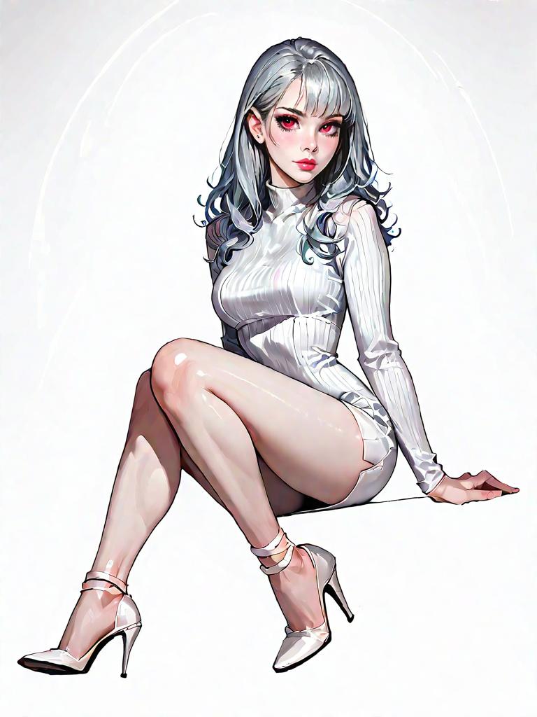 A realistic digital illustration of a fashionable woman with short blonde hair, posed sitting on the ground. She wears a sleek sleeveless black faux leather jumpsuit with a high neckline and a zipper front, paired with shiny black boots. The woman accessorizes with a wristwatch featuring a large dial on a metallic bracelet. The background is minimal, highlighting the chic and modern style of the subject.