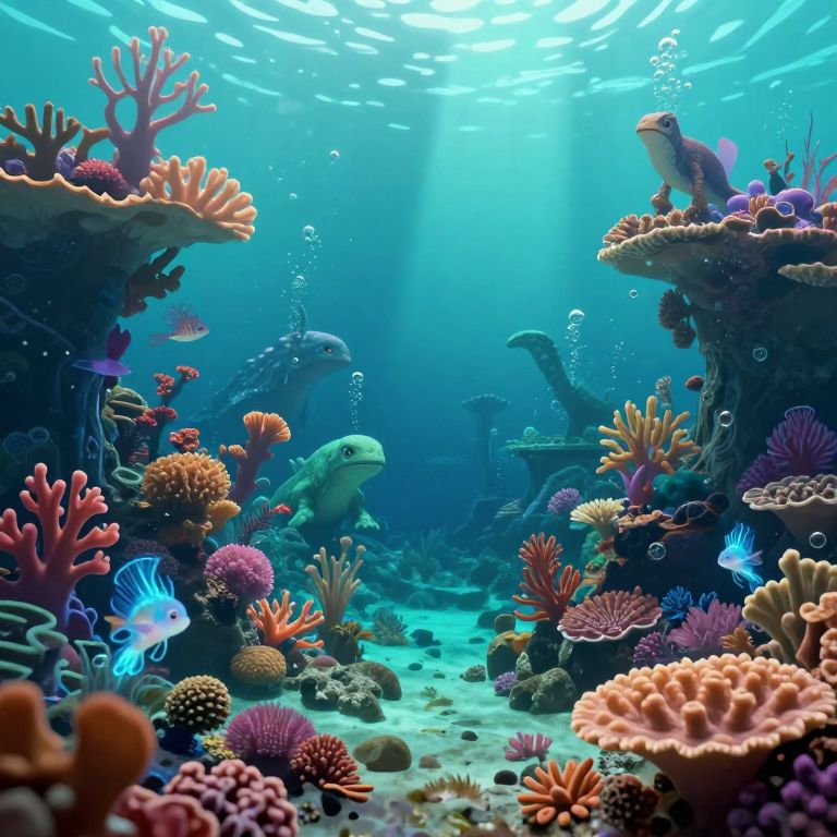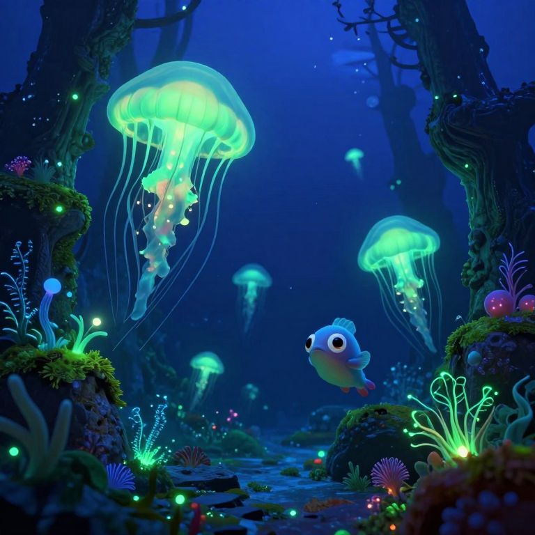 A mesmerizing digital artwork transports viewers into an enchanting underwater realm, where a luminous creature gracefully glides through the depths. From a unique vantage point, this otherworldly scene unveils towering aquatic structures and swaying, bioluminescent flora, casting soft shadows that enhance the mysterious allure of the landscape. The radiant presence of the fantastical creature illuminates its surroundings with an ethereal glow, blending elements of fantasy and whimsy to create a breathtaking visual experience that captivates the imagination and invites exploration into a realm where reality intertwines with the extraordinary.