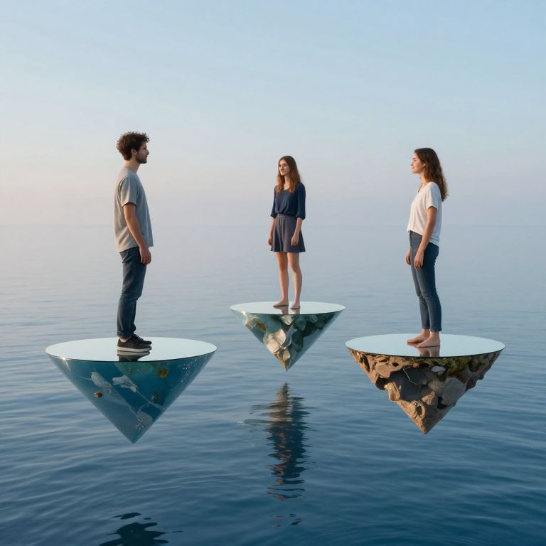 Suspended between sky and sea, three figures stand upon liquid mirrors that reveal not reflections, but alternate selves—each island a portal to parallel worlds, where echoes of joy and sorrow intertwine, inviting introspection on the infinite possibilities of existence.