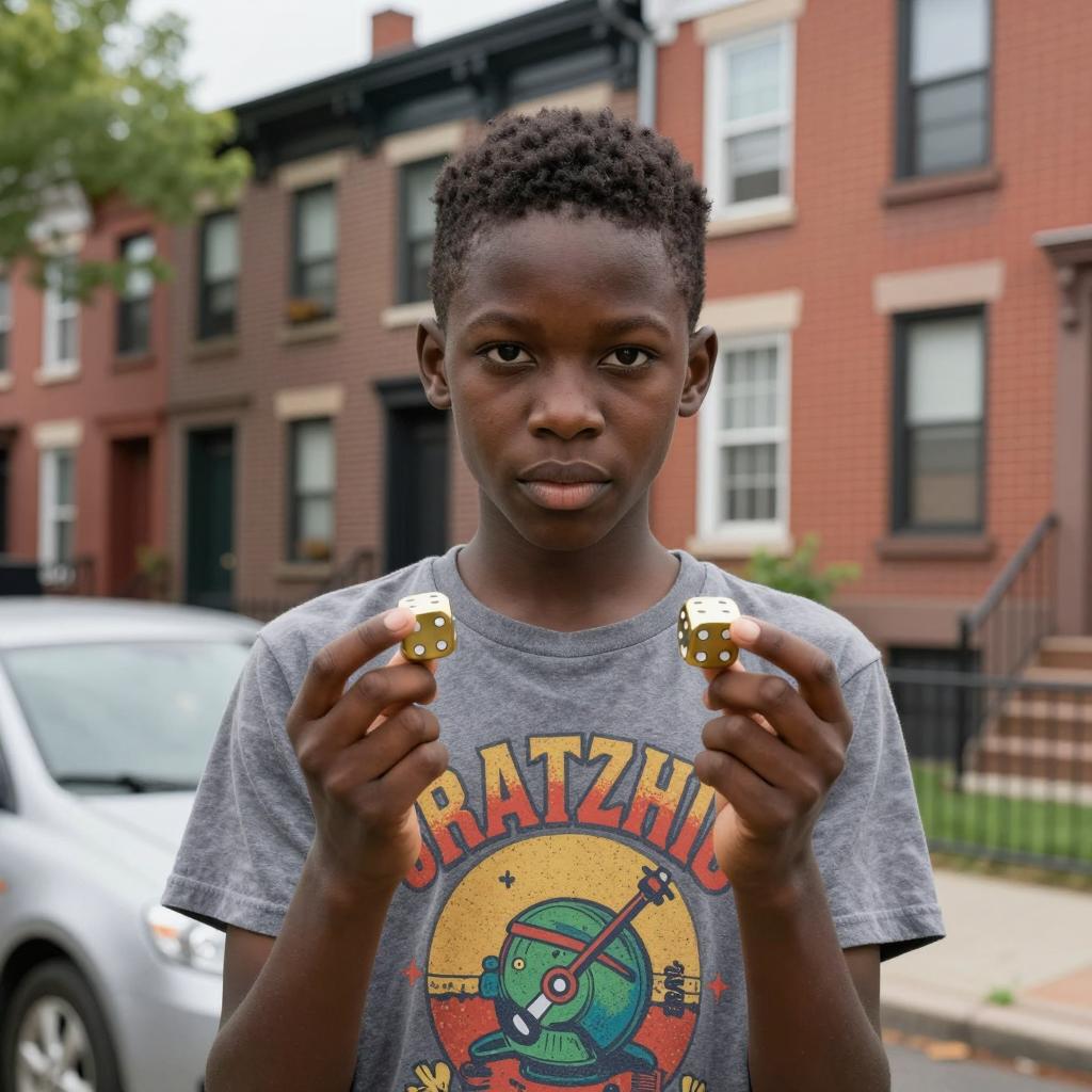 Young Black boy with short hair, wearing a colorful graphic t-shirt, holding two gold dice in front of him. Background: row of red and brown brick townhouses, green tree on the left, silver car in the foreground. Intense expression.