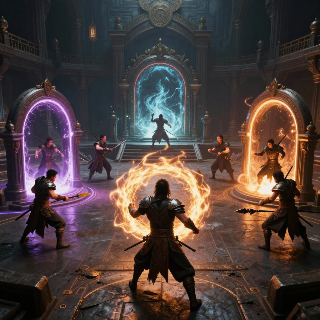 This digital fantasy artwork depicts a dark, grand hall with ornate stone architecture. At the center, six warriors clad in medieval armor with dark, flowing cloaks wield fire magic, each surrounded by a glowing, circular portal. The warrior in the foreground, facing away, conjures a large, swirling flame. The background features a central, larger portal emitting a blue, ethereal light and a silhouetted figure within. The floor is wet, reflecting the vibrant colors of the portals and flames. The overall scene is dynamic and intense, with dramatic lighting and a sense of impending battle.