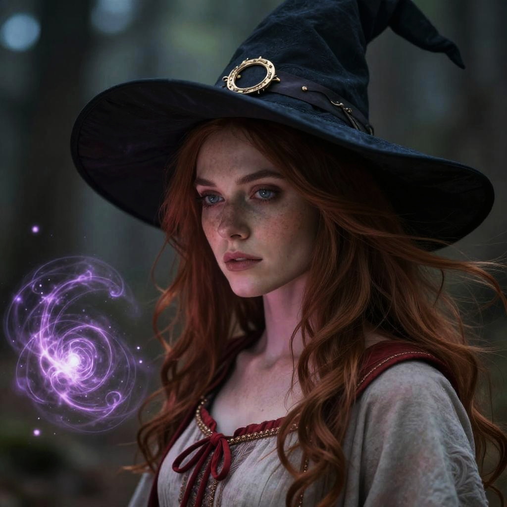 Photorealistic, 35mm, intricate details, hdr, hyperdetailed, natural skin texture, hyperrealism, sharp, 1 girl, adult (elven:0.7) woman, freckles, grey eyes, chestnut layered hair, portrait, looking down, solo, half shot, detailed background, witch hat, witch, magical atmosphere, hair flowing in the wind, red trimmed light colored clothes, whirlwind of swirling magic spell in the air, dark magic, (style-swirlmagic:0.8), floating particles