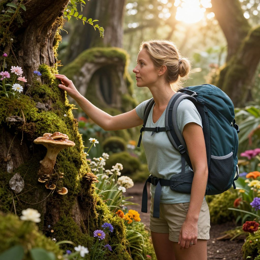 A woman in hiking gear explores a lush, fantastical trail with moss, fungi, and flowers, her face detailed and beautiful, set against a golden-hour glow.