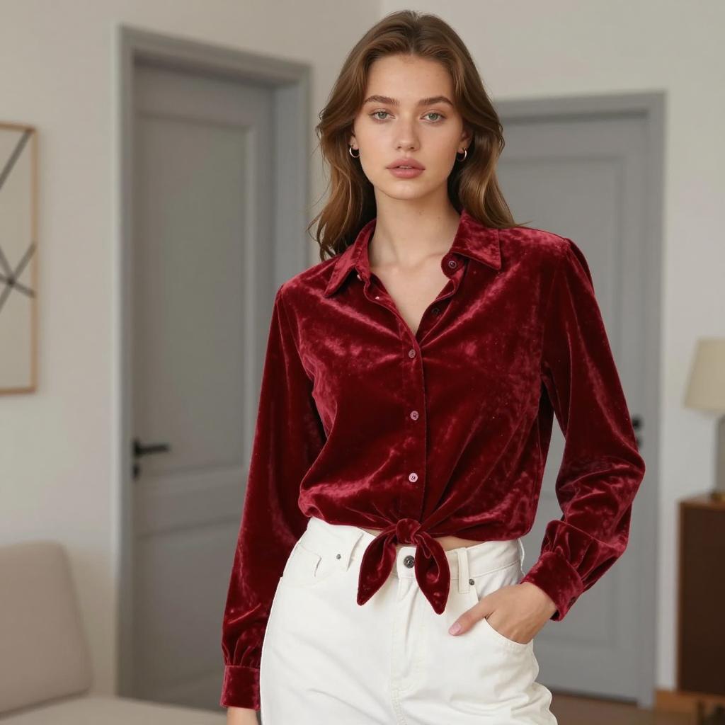 Woman with light brown skin, dark brown hair in messy bun, wearing pink satin shirt and pink floral shorts, sitting on black chair, right hand touching forehead, left hand on wooden table, gold necklace with circular pendant, white wall background, wooden shelf with yellow book and basket, dim lighting.