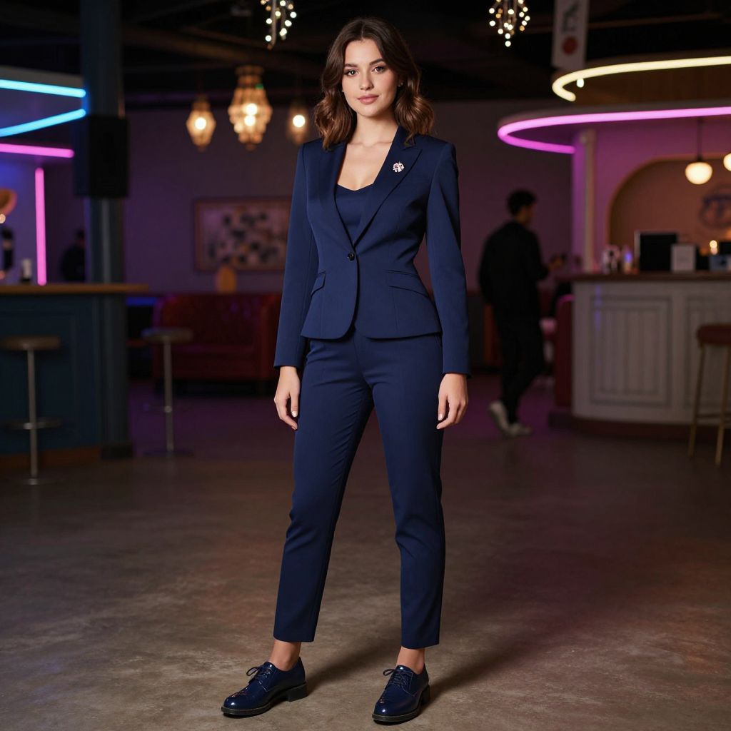 A realistic photograph of a young female adult in her late 20s with medium-length brown hair and warm brown eyes, wearing a stylish navy blue costume outfit featuring a fitted navy blazer, navy blue dress pants, and navy blue leather shoes, standing in a dimly lit indoor theme party setting with soft neon lights and hanging decorative lights.