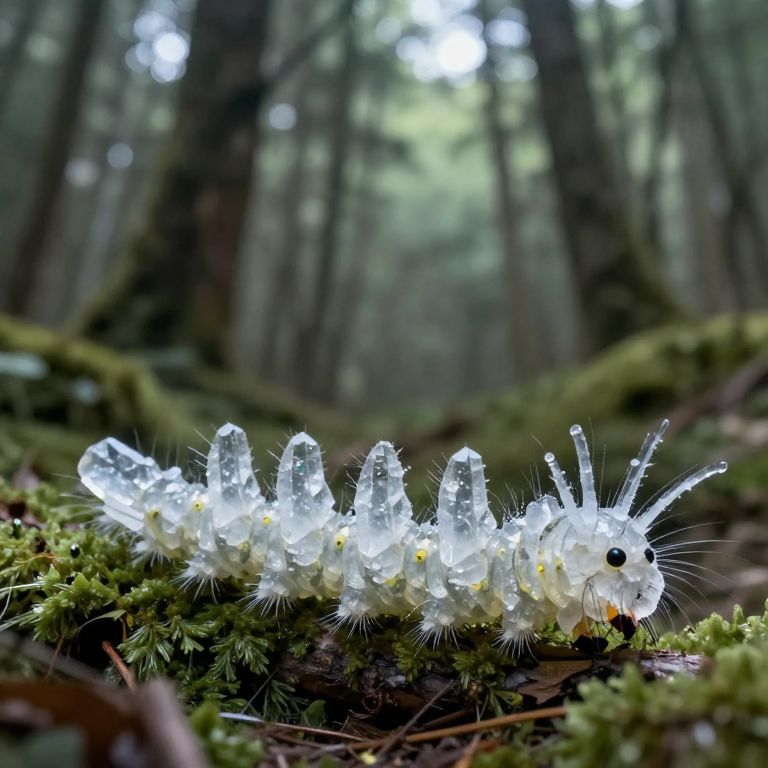 Photograph of a forest floor featuring a close-up of a small, translucent caterpillar covered in sparkling ice crystals, resembling a fairy-tale creature. The caterpillar has delicate white flowers on its body and is surrounded by green moss and small pine needles. The background is a blurred forest with tall, dark trees and dappled sunlight filtering through the leaves, creating a serene, magical atmosphere. The image highlights the contrast between the bright, crystalline caterpillar and the dark, earthy forest background.