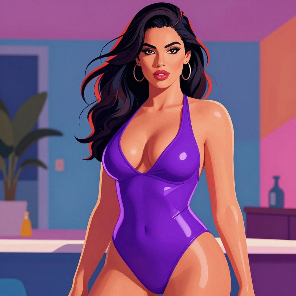 Digital illustration of a curvy woman with long black hair in a tight, shiny purple one-piece swimsuit, standing confidently in a colorful, modern room