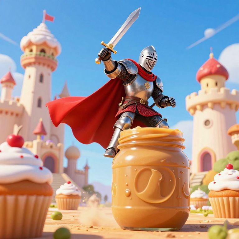 In a whimsical 3D-rendered fantasy scene, a medieval knight clad in gleaming armor and a flowing red cape triumphantly rides atop a colossal peanut butter jar, brandishing a sword as he charges toward towering frosted cupcake castles under a vibrant blue sky.