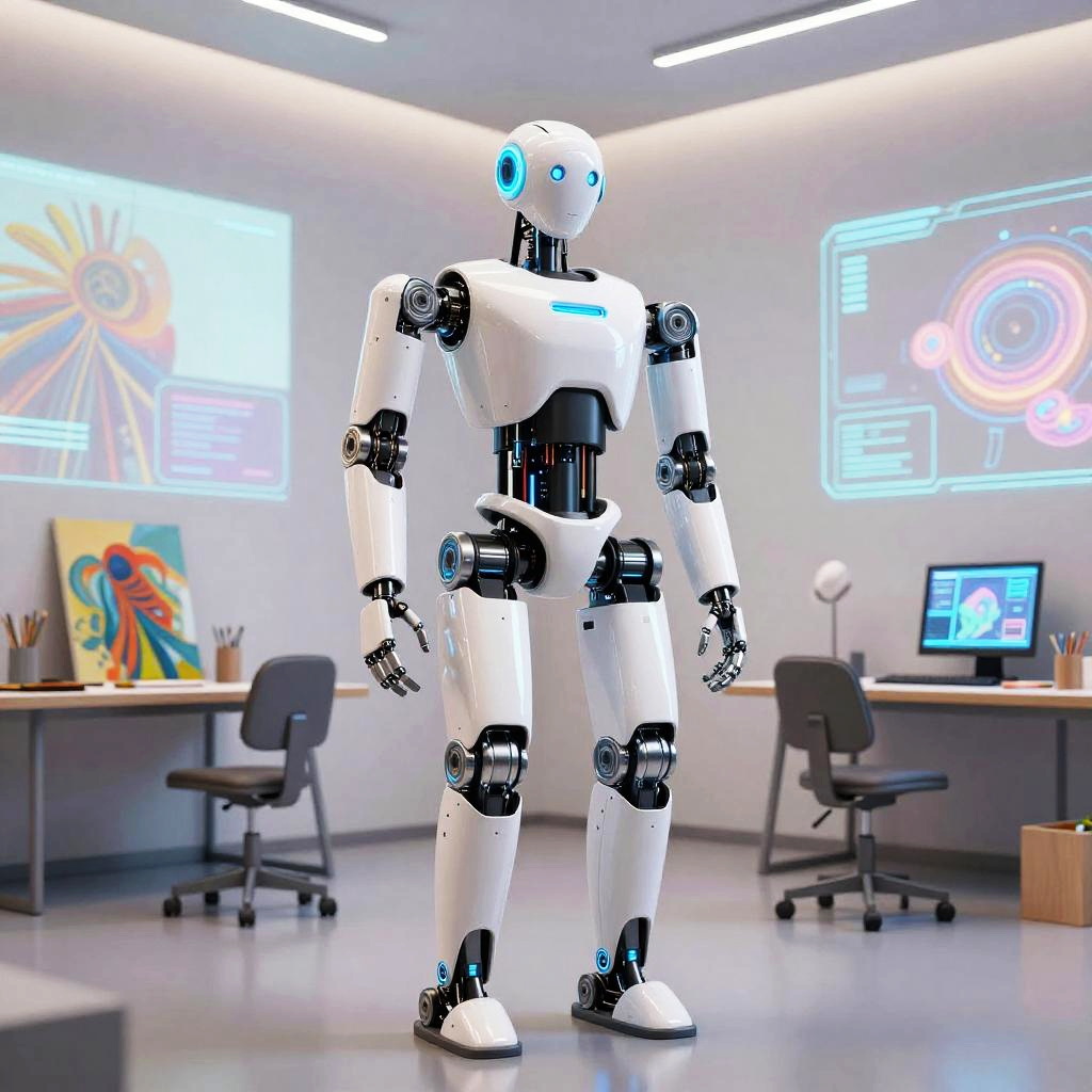 AI full body robot artist creating digital paintings, multi-functional arms with various tools, standing in a creative studio filled with holographic art projections, sleek white and silver finish, futuristic minimalistic interior, soft ambient lighting
