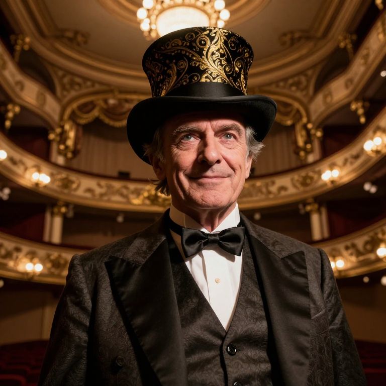 Craft a hyperrealistic portrait of a seasoned magician from his perspective, standing before a grand Victorian theater. The magician dons a top hat with intricate golden patterns and a tailored suit, his subtle smirk exuding both confidence and mystery. Soft, warm stage lighting casts dramatic shadows across his face, emphasizing the fine lines of years of performance. Gilded theater curtains and ornate chandeliers reflect in his eyes, hinting at the grandeur that awaits on stage. The scene is captured from a unique low-angle view, framing the magician's entire figure with power and mystery.