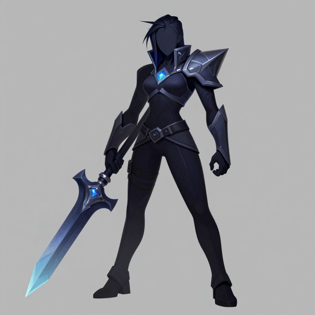 Silhouetted female warrior in dark armor, glowing blue accents, holding large blue glowing sword, standing confidently against light blue background. Digital art.