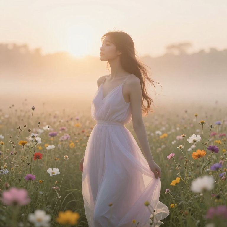Sinuette designed as a delicate silhouette blending into a field of blooming wildflowers at sunrise, soft mist and gentle golden sunlight creating a magical glow, warm pastel tones with emphasis on smooth, flowing curves and natural harmony, calming and inviting mood